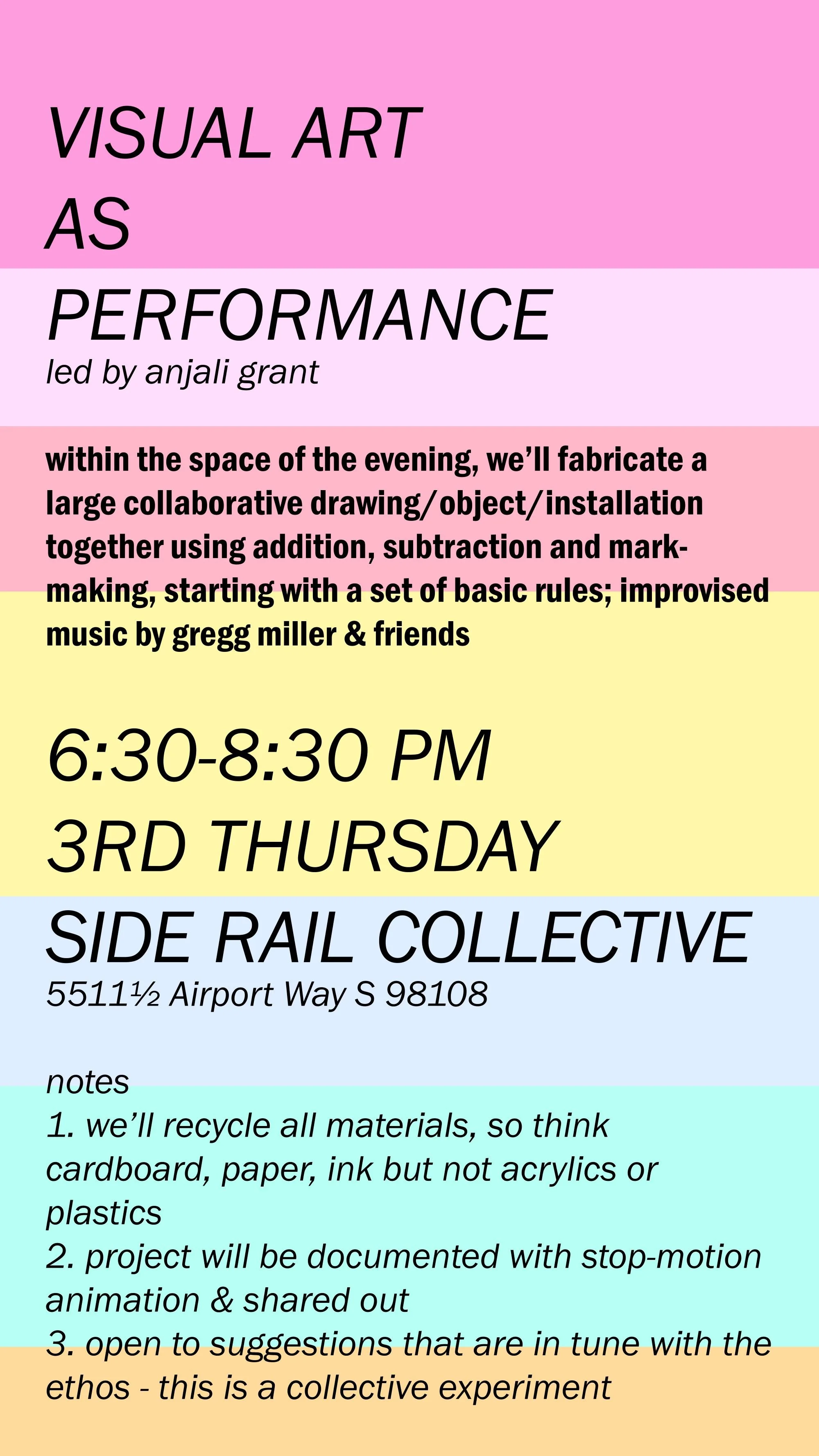 Side Rail is joining forces with Beacon Hill based artist and architect Anjali Grant and improv abstract musician Gregg Grant to offer a unique collaborative art and music making opportunity to the public once a month!
